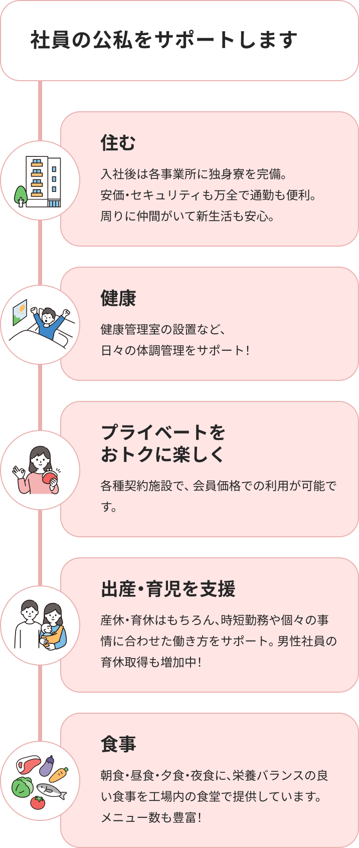 ヤマザキでは、従業員が安心して長く働くことができるよう様々な制度や環境を整備し、皆さんの健康で楽しい毎日をサポートしています。