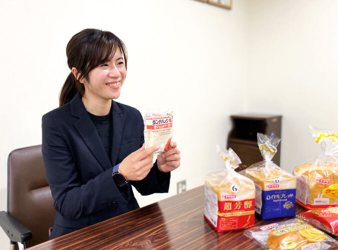 昔から食べることや料理を作ることが大好きで、自分が作った商品をたくさんの人に食べてもらいたいと思い、ヤマザキに入社しました。また、就職活動を行う中で、ヤマザキの社員の温かさを感じ、このような素敵な雰囲気の職場で私も働いてみたい!!と思ったことが入社の決め手です。