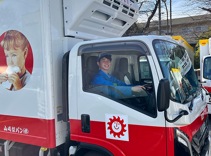 私はセールス課に所属し、安全第一を心掛けながらヤマザキの製品を販売店様へ定時・定量・定温でお届けしています。トラックに掲げられた「ヤマザキ」の文字を背負う“走る広告塔”としての自覚と責任感を持ち、日々業務に取り組んでいます。