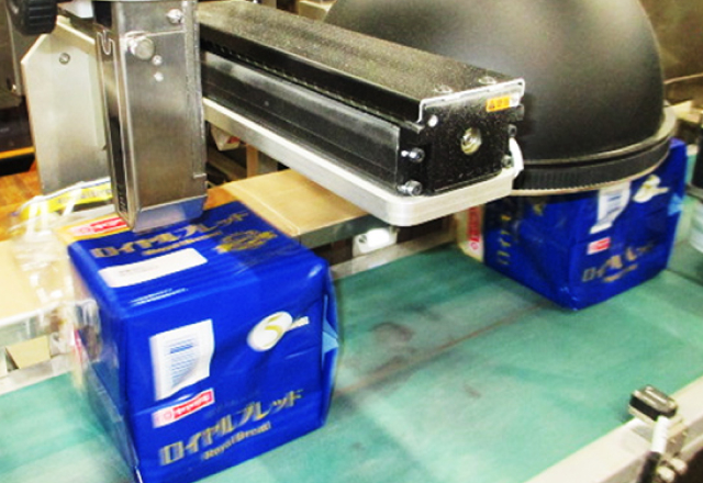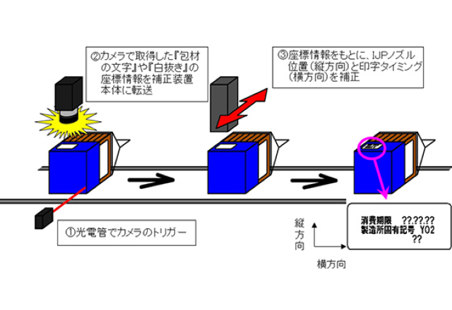 製品表示で欠かせない消費期限表示。この所定の表示位置の中心に印字されないという課題をカメラ技術を活用して改良開発した事例です。光電管でカメラのトリガーモードを起動させ、カメラで取得した「包材の文字」や「白抜き」の座標情報を補正装置本体に転送します。
