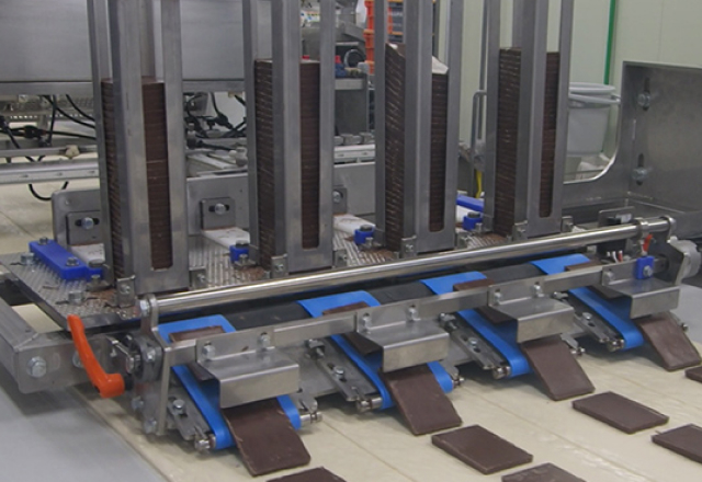中には板チョコが入っていますが、従来この板チョコは全て手作業で生地の上に乗せて、成型していました。