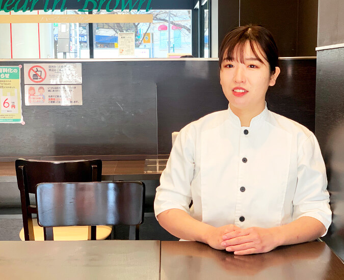 現在、ヤマザキが直営する「ハースブラウン八柱店」というベーカリーショップで『店長』として働いています。従業員とともにお客様に高品質な製品とベストサービスを提供するため、特に店頭に並ぶ製品の焼色や品揃えには気を配っていますね。