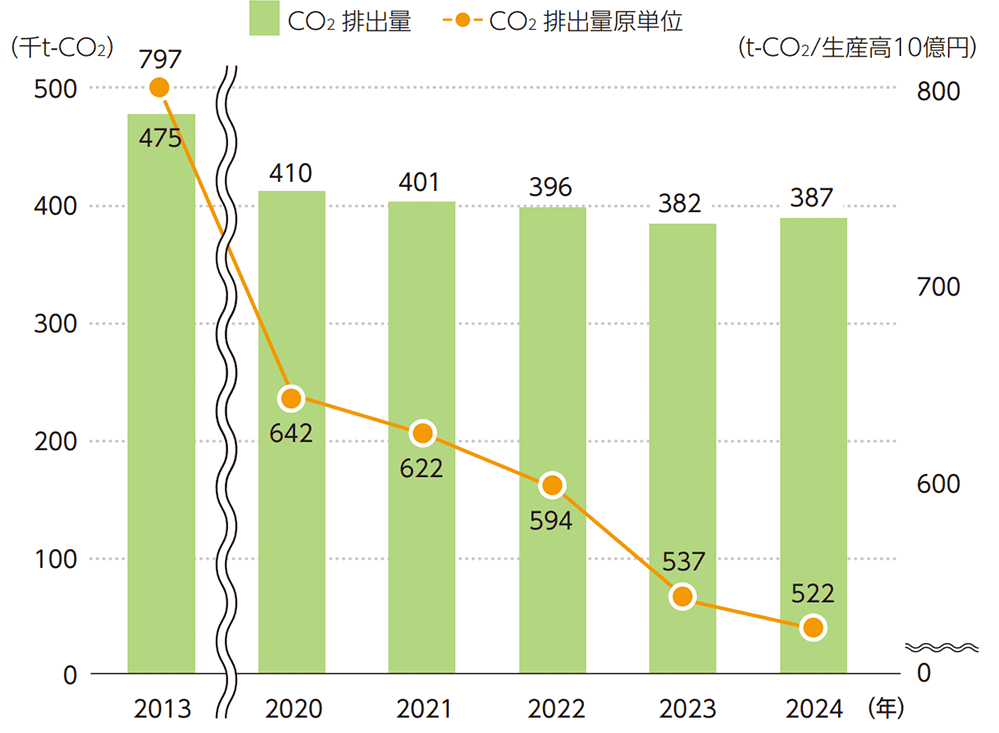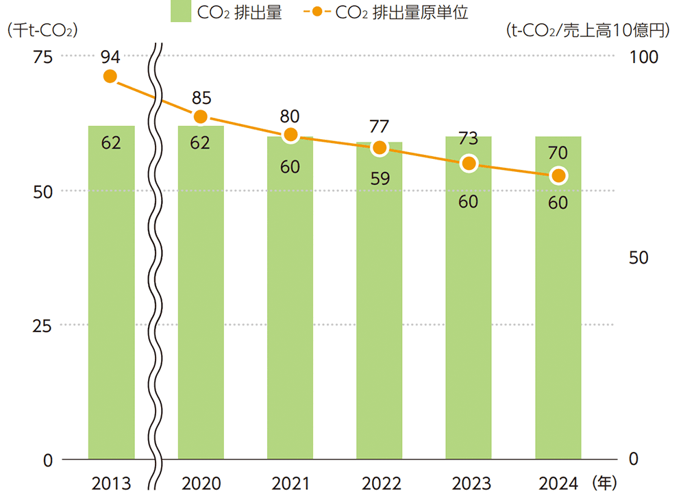 当社グループは、気候変動の緩和に貢献するため、工場、物流、小売店舗のそれぞれにおいて、CO2排出量削減対策に積極的に取り組んでいます。2024年のScope1・2のCO2排出量は677千トン(前年比103%)でした。